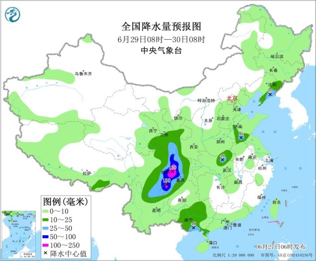 預計今天,雲貴至蘇皖南部一帶仍將有較強降水,雲南南部、貴州南部和東部、廣西中西部、湖南北部和西部、湖北東部、安徽中南部、江蘇南部等地的部分地區有大到暴雨,其中,貴州東南部、廣西北部等地局部地區有大暴雨(100~140毫米)。上述部分地區伴有短時強降水(最大小時降雨量20~40毫米,局地可超過50毫米),局地有雷暴大風等強對流天氣。中央氣象台今晨繼續發佈暴雨藍色預警。