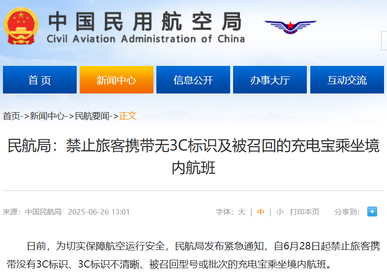 2025年以來,旅客攜帶的充電寶等鋰電池產品引發的機上險情有所增多。加之多個頭部品牌因電芯安全風險實施召回,部分廠家3C認證被撤銷或暫停,充電寶的安全質量隱患日益凸顯,對民航運行安全構成了持續威脅。民航局此次決定,在現有政策基礎上,參照國際通行標準《危險物品安全航空運輸技術細則》,進一步收緊管控。