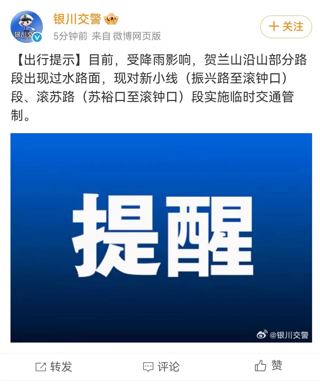 銀川市水務局與銀川市氣象局2025年06月27日09時10分聯合發佈山洪災害氣象風險黃色預警:目前我市西夏區沿山甘溝站累計降水量已達20.3毫米。預計27日09時10分至28日08時00分,賀蘭山沿山仍有短時強降水,累計雨量10~30毫米。上述地區山洪災害高易發區氣象風險等級為三級。6月27日09時10分到28日08時00分,小口子溝,石灰窯溝,蘇峪口溝,響水溝等山洪溝道可能發生山洪災害,請注意防範。