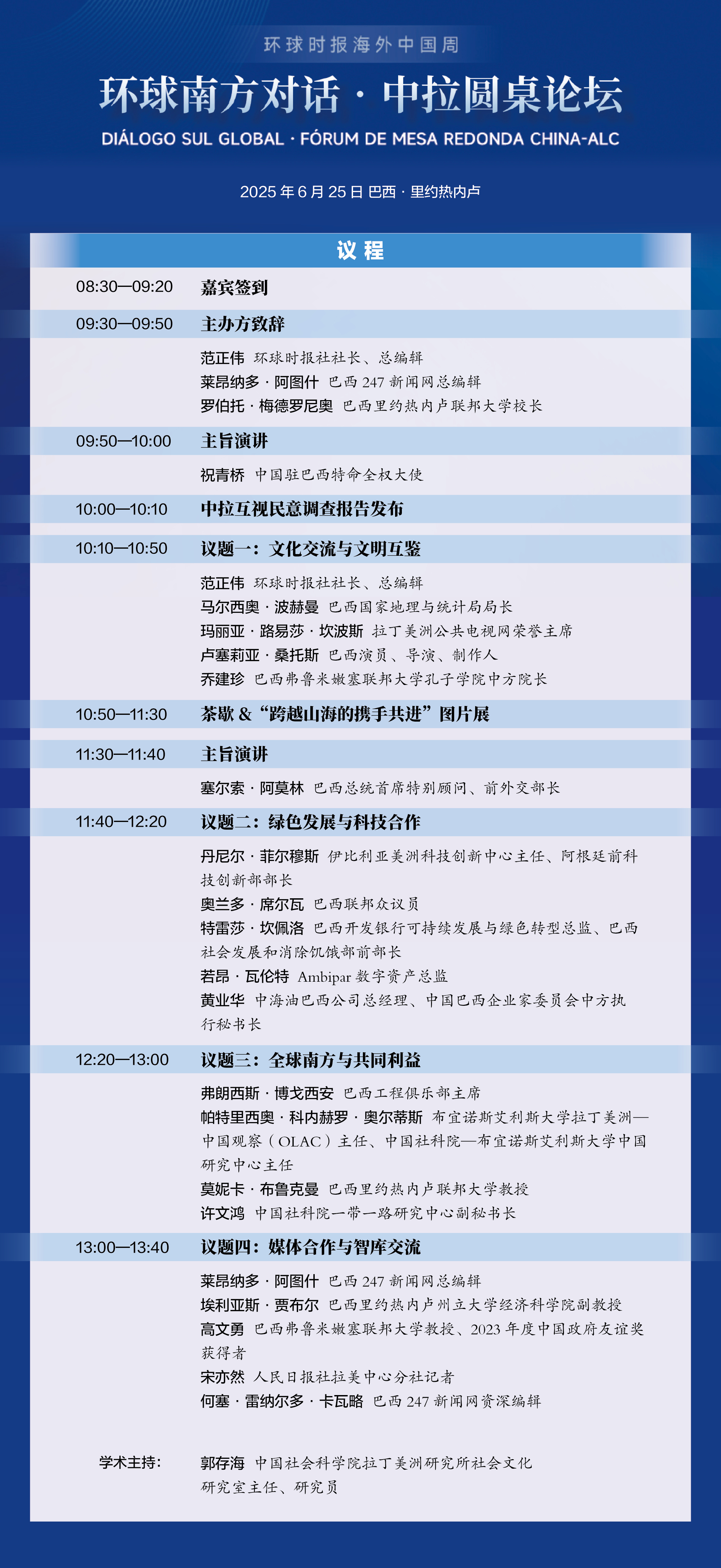 作為全球南方的重要成員,中國與拉美和加勒比國家增強彼此認知、促進交流互鑑,將積極推動中拉合作的不斷深化拓展。在金磚國家領導人第十七次會晤將於巴西里約熱內盧召開之際,環球時報社與巴西247新聞網、巴西里約熱內盧聯邦大學聯合舉辦“環球時報海外中國周暨環球南方對話·中拉圓桌論壇”,以切實行動踐行全球文明倡議,為中拉建設“五大工程”貢獻媒體力量。