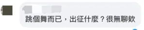 不少網友惋惜,“可憐,連做生意的自由也沒了”,有人不解,“跳個舞而已,出征什麼?”“台灣真的變得很恐怖”,還有網友諷刺,“前陣子説‘至少我們還有音樂’,這下連音樂都沒了”,更有人笑稱,“要改歌詞 大展‘綠圖’”。