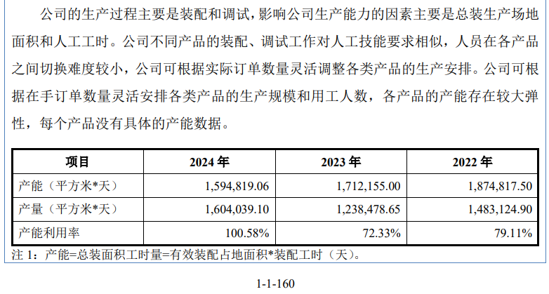 根據公開資料顯示,奧美森此前於2022年申請在創業板上市,但最終並未能成功。在前次申請創業板上市時,針對當時的募投項目“非標自動化生產線成套裝備生產基地建設項目”中提到:“項目建成後,可較大程度地緩解公司當前非標自動化設備產能緊張問題,進而有效滿足日益增加的市場訂單需求”。根據本次申請在北交所上市的招股説明書披露,奧美森在2022年到2024年期間產能持續萎縮。