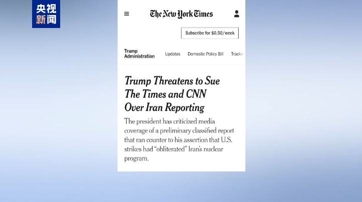 據美國《紐約時報》報道,美國總統特朗普25日威脅起訴《紐約時報》和美國有線電視新聞網(CNN),原因是這兩家美國媒體報道稱,初步評估報告顯示,美國對伊朗核設施的打擊僅使伊朗核計劃推遲數月。而這與特朗普稱完全“摧毀”伊朗核設施的説法有出入。特朗普的一名私人律師致信《紐約時報》,稱該報道“虛假”,損害美國總統聲譽,要求“撤回並道歉”。