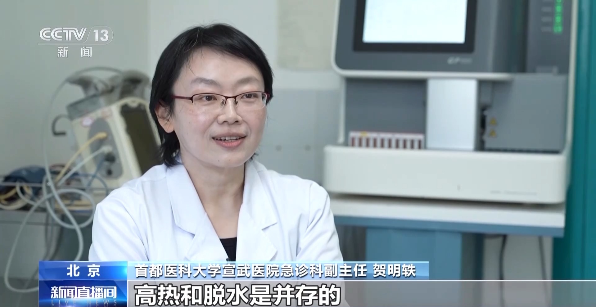 *首都醫科大學宣武醫院急診科副主任 賀明軼:*高熱和脱水是並存的。如果這個患者是意識清楚的,在院外可以採取讓患者喝水的方法,但要注意,一是不能喝太涼的水,另外我們要喝含電解質的水。