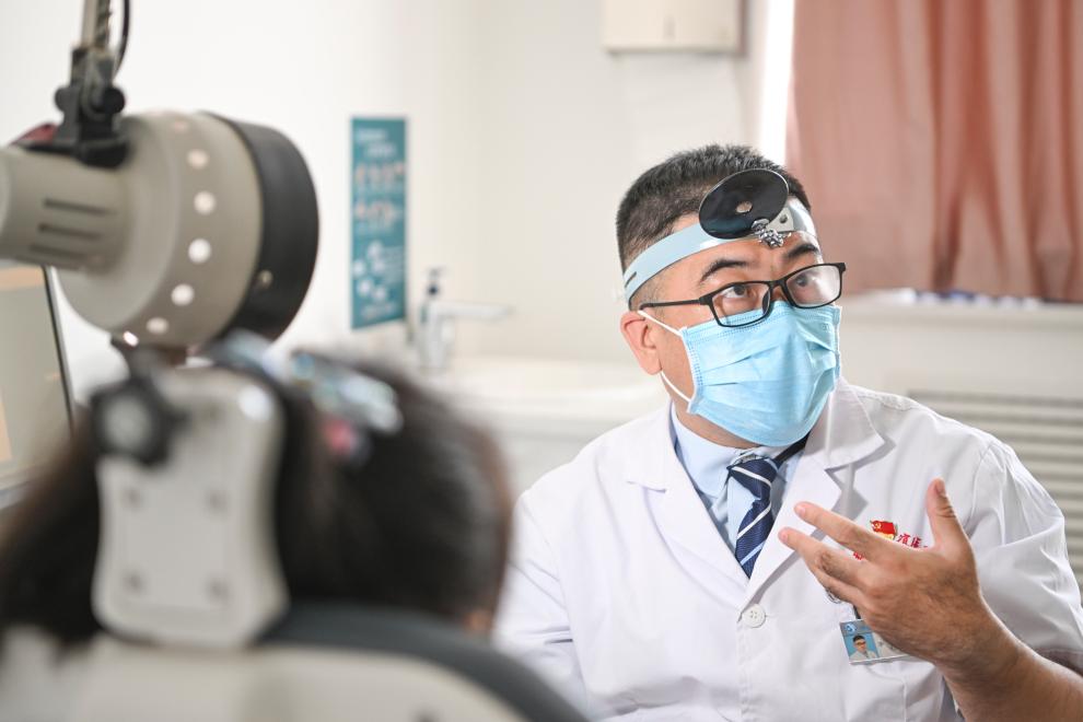 李飛為患者講解病情(6月24日攝)。新華社記者 胡虎虎 攝