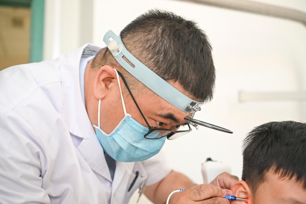 李飛為患者檢查身體(6月24日攝)。新華社記者 胡虎虎 攝
