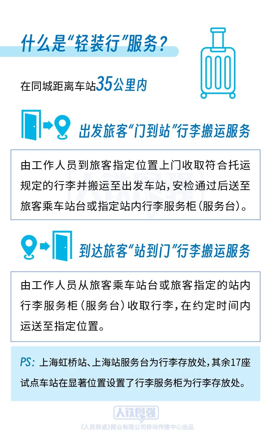 在同城距離車站35公里內,旅客根據實際需要可選擇以下兩種“輕裝行”服務。*一是出發旅客“門到站”行李搬運服務。*選定此項服務後,由工作人員到旅客指定位置上門收取符合託運規定的行李並搬運至出發車站,安檢通過後,送至旅客乘車站台或指定站內行李服務櫃(服務枱)。*二是到達旅客“站到門”行李搬運服務。*選定此項服務後,由工作人員從旅客乘車站台或旅客指定的站內行李服務櫃(服務枱)收取行李,在約定時間內運送至指定位置。目前,上海虹橋站、上海站服務枱為行李存放處,其餘17座試點車站在顯著位置設置了行李服務櫃為行李存放處。