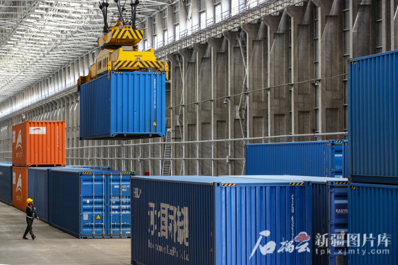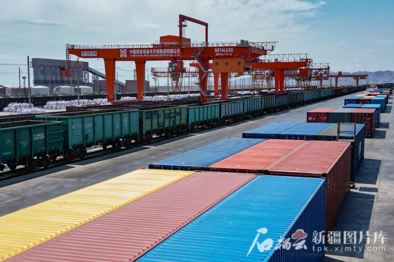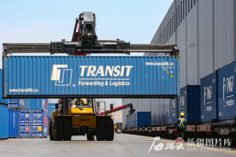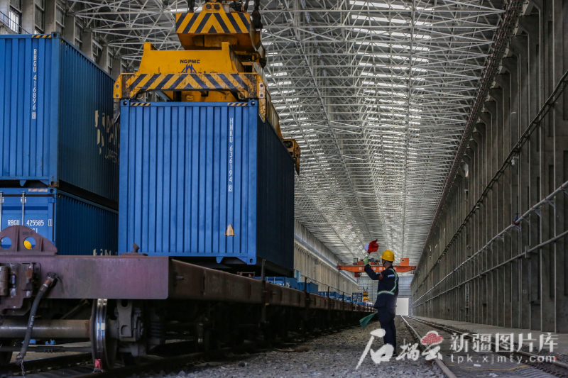 6月24日,阿拉山口站中歐(中亞)班列換裝區龍門吊往來穿梭,吊裝貨物。