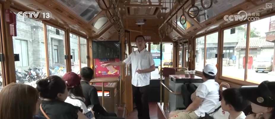 與此同時,一輛老北京仿古鐺鐺車正載着遊客欣賞了北京中軸線沿途的美景,聽講解員講述着這裏的故事。