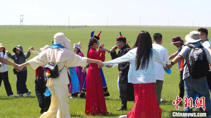 歡迎儀式上,馬頭琴手奏響旋律,身着民族服飾的舞者跳起歡快的蒙古族舞蹈。氣氛漸濃,台胞加入到表演當中來,戴着哈達,手拉手圍成圈,伴着歌聲在草原上起舞。