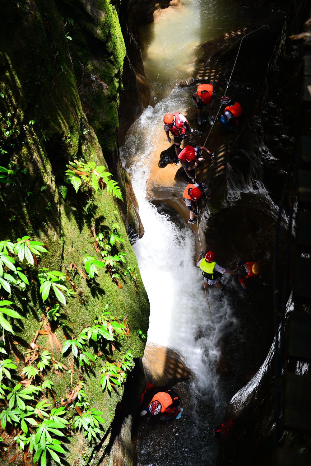 遊客在金刀峽景區體驗溪降。(秦廷富 攝)