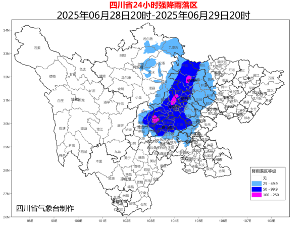 6月28日20時到29日20時:綿陽、德陽、成都、眉山4市,廣元、資陽、內江、自貢4市西部,樂山、雅安2市北部及阿壩州東部的部分地方有大雨到暴雨(雨量30~80毫米),局部大暴雨(雨量150~180毫米),最大小時雨強50~70毫米,雷雨時伴有短時陣性大風。