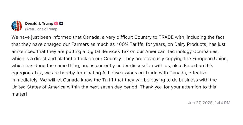 特朗普在“真實社交”上發文説:“我們剛剛得知,加拿大宣佈要對美國技術公司徵收數字服務税,這是公然對我們國家進行直接攻擊。”