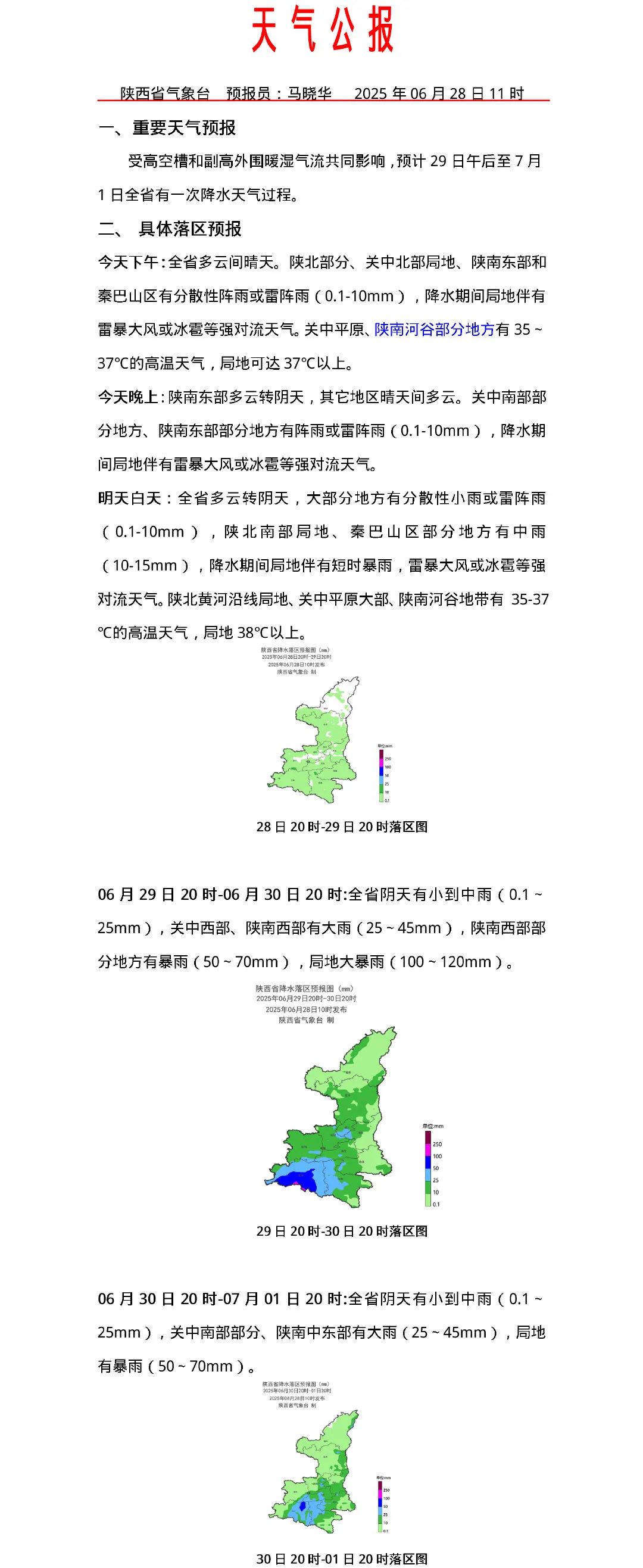 6月29日夜間至7月3日受低槽和副高外圍暖濕氣流共同影響,全省有4天間斷性降水天氣,疊加對流性天氣活躍,陝北局地、關中西部、陝南西部有大到暴雨,其中6月30日至7月1日陝南西部(漢中、安康西部)有暴雨。此外,受降水影響,關中高温天氣有所減弱。