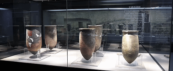 “這是一件出土於安徽蒙城新石器時代尉遲寺遺址的大口陶尊,距今大約4800年。”講解員指着一件陶器展品,“它的特別之處是器物上有着刻畫符號,分別是‘日’‘月’‘山’形。抽象的表達和組合,已經超越了簡單的圖畫,使我們看到了漢字的雛形。”