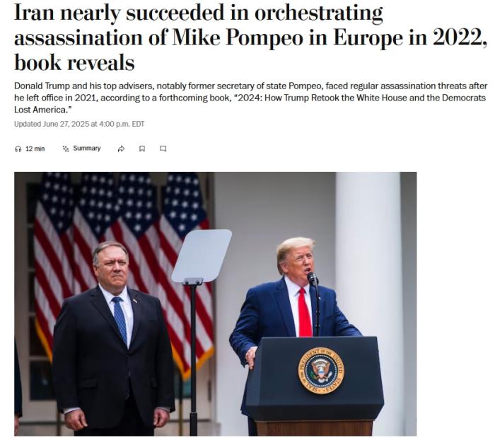 據報道,這本名為《2024:特朗普如何重新奪回白宮以及民主黨如何失去美國》的新書計劃在7月出版,其中披露了在2022年,伊朗幾乎成功地在歐洲一家酒店暗殺蓬佩奧。