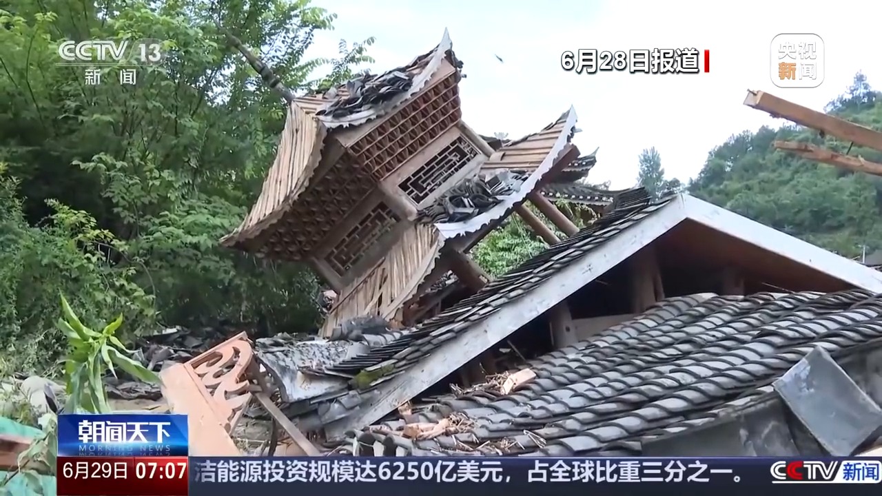 *總枱記者 郭亦馨:*我現在所在的是黔東南州丹寨縣的石橋村。受到新一輪強降雨的影響,當地遭遇較為嚴重險情。由於石橋村距離河道較近,所以民居被淹情況較為嚴重。可以從我所處的這一處民居看到,像我身後這處民居院落的外圍圍牆,現在已經在洪水的沖刷下全部倒塌。而在我斜後方也依稀可見,之前這裏一處木質結構的民居和觀景亭,也是受到洪水沖刷,現在已經完全倒塌。通過民居牆上殘存的洪水過境時留下的最高水位線判斷,在峯值時水位已經達到了接近一人高,幾乎將民居的一層全部淹沒。