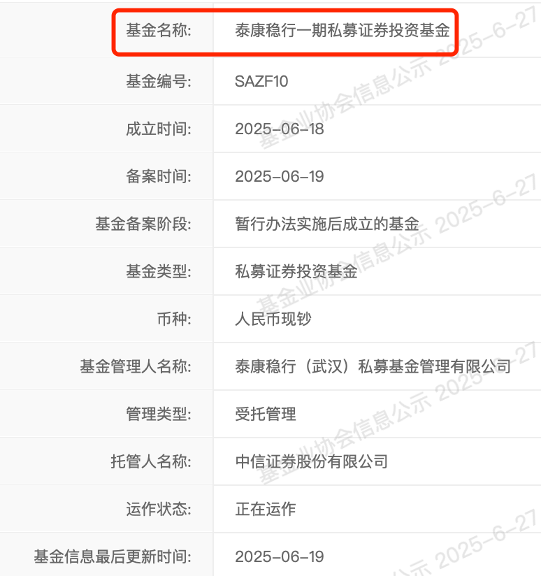泰康穩行由泰康資產1000萬元全資設立,作為基金管理人向泰康人壽定向發行契約型私募證券投資基金。今年1月,泰康人壽和泰康資產獲金融監管總局批准參與長期投資試點,獲批金額120億元。泰康方面表示,此舉旨在增加長期投資資產,優化資產負債匹配,提高資金使用效率,助力資本市場平穩運行。