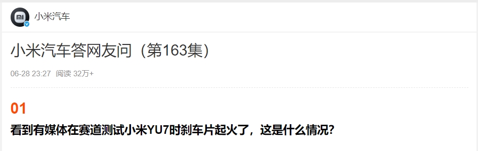 【環球網科技綜合報道】6月29日消息,針對“小米YU7賽道測試時剎車片起火”事件,小米汽車回應稱,視頻中,小米YU7 Max在天津V1賽車場進行1個暖胎圈+1個飛行圈後,在未進行散熱圈的極端情況下,直接駐車,高温導致制動片有機物材料發生起火,但制動系統整體未出現任何制動失效等問題,功能健全,使用正常。