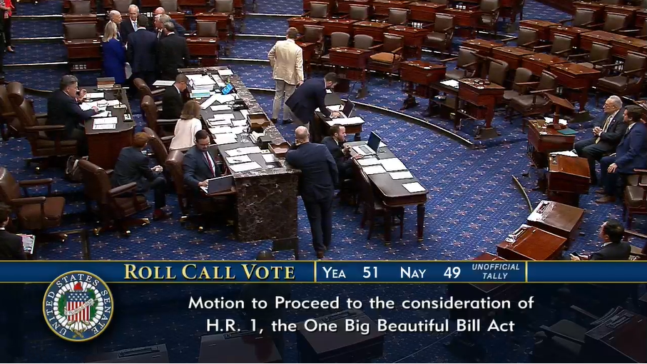 當地時間6月28日,美國參議院以51對49的票數比通過一項程序性動議,這項動議旨在推進被美國總統特朗普稱為“大而美”的大規模税收與支出法案。美國參議院程序性投票通過後,未來幾天法案通過的可能性增加。