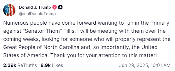 共和黨籍北卡羅來納州參議員湯姆·蒂利斯投下反對票後,特朗普在社交媒體發文威脅道,許多人都想在明年的議員競選中與蒂利斯競爭,他將在未來幾周與這些人會面,尋找一位“能夠真正代表北卡羅來納州人民以及美國”的人選。