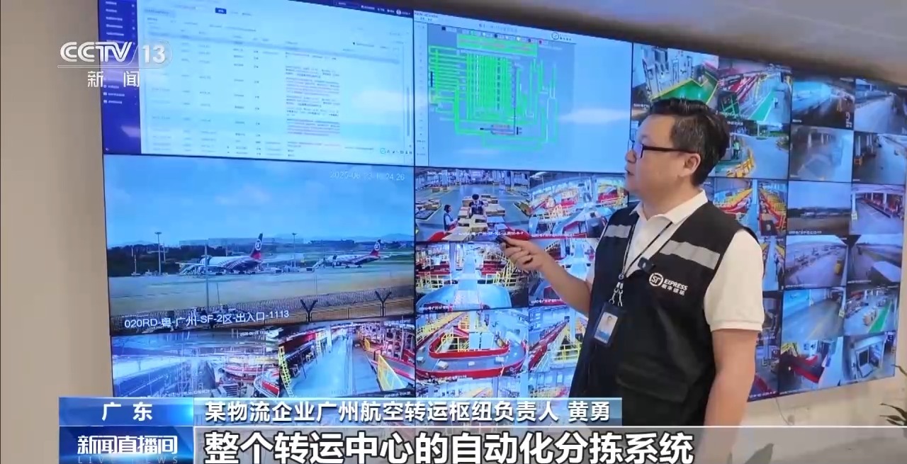 某物流企業廣州航空轉運樞紐負責人 黃勇:在12點54分,運用轉運中心的自動化分揀系統,就已經分配到了航空的配載區域,再運用AI智慧系統,匹配相應的最優的時效航班,發運到指定目的地。