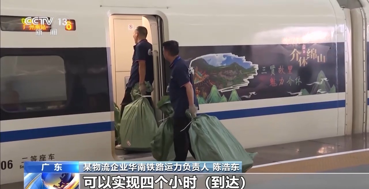 某物流企業華南鐵路運力負責人 陳浩東:從廣州到武漢如果走冷鏈車的話,要15個小時左右,通過現在高鐵運輸,可以實現四個小時到達。