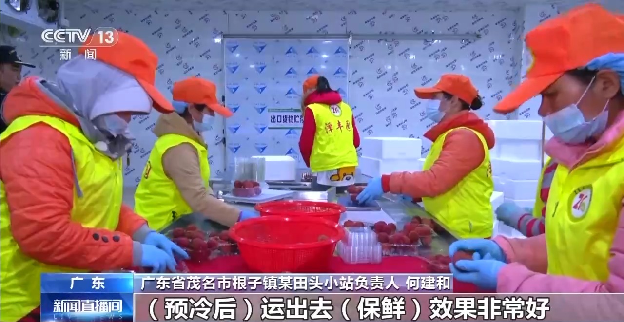 廣東省茂名市根子鎮某田頭小站負責人 何建和:都是十幾二十分鐘路程,不遠的,都是周邊果園的荔枝,摘下來馬上運去田頭小站,冷庫預冷一到兩個小時,預冷後運出去保鮮效果非常好,一天干10到12個小時,差不多7萬多斤一天。