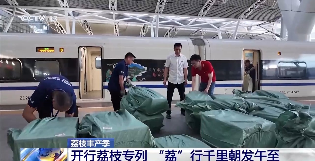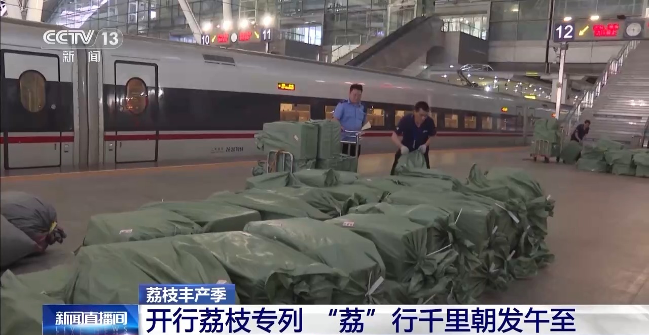 據介紹,今年6月5日至22日期間,國鐵廣州局每日固定開行兩趟荔枝專列,分別是從廣州白雲站始發G568次和廣州南站始發G696次,每日預留4節高鐵車廂,日均運量超8噸。