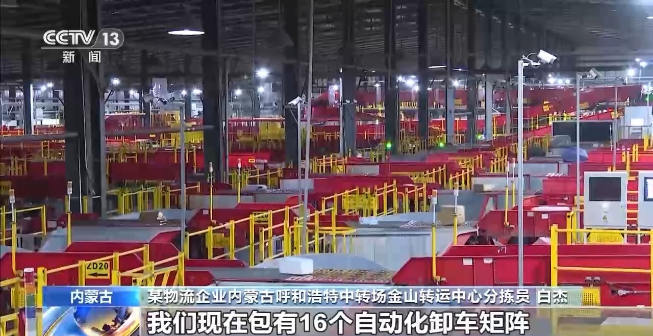 某物流企業內蒙古呼和浩特中轉場金山轉運中心分揀員 白傑:我們場地現在承接公路、鐵路、航空的運輸,現在有16個自動化卸車矩陣,從整個快件到達場地之後,我們只需要最快三分鐘就可以完成快件的中轉場的分揀。