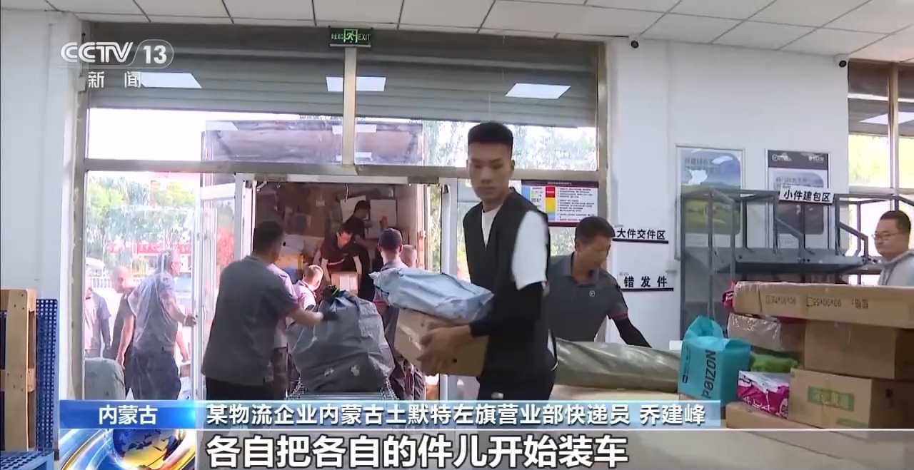 某物流企業內蒙古土默特左旗營業部快遞員 喬建峯:大家一起卸車分揀,卸完車之後,各自把各自的件裝車,8點左右開始送。