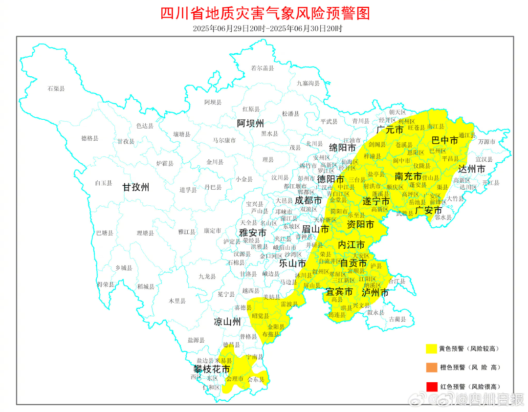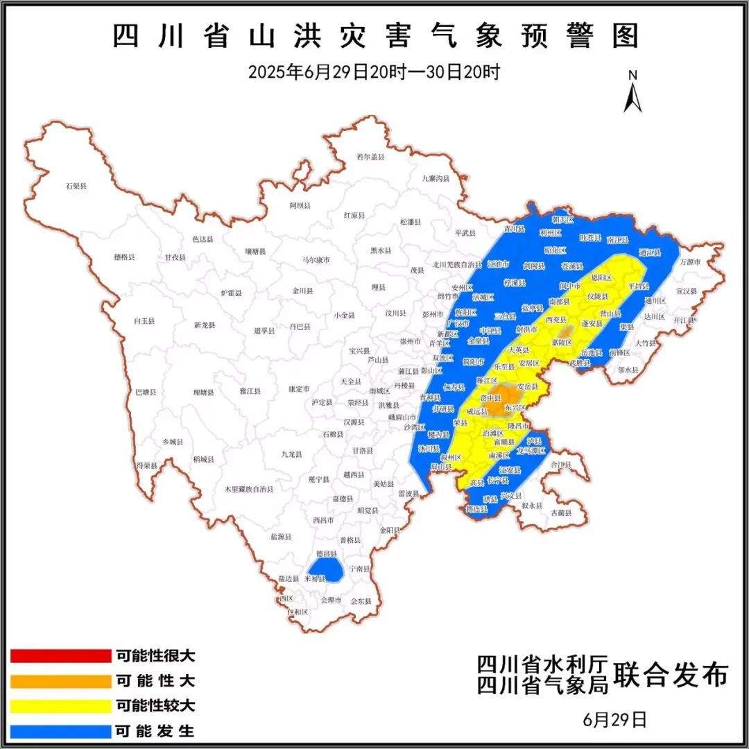 預警信息顯示,6月29日20時至30日20時,內江市市中區、資中、東興、威遠,遂寧市大英,資陽市安嶽、雁江,自貢市沿灘、富順,南充市嘉陵、順慶等11個縣(市、區)發生山洪災害可能性大(橙色);內江市隆昌,遂寧市安居、蓬溪、船山、射洪,資陽市樂至,自貢市自流井、貢井、大安、榮縣,南充市高坪、西充、儀隴、蓬安、營山、南部、閬中,宜賓市翠屏、敍州、南溪、屏山、高縣、江安,巴中市恩陽、巴州、平昌、南江、通江,廣安市武勝、嶽池,廣元市蒼溪,德陽市中江,綿陽市鹽亭、三台,瀘州市瀘縣,成都市簡陽,眉山市仁壽等37個縣(市、區)發生山洪災害可能性較大(黃色);宜賓市長寧、珙縣、筠連、興文,廣安市廣安、前鋒、華鎣,廣元市劍閣、昭化、旺蒼、利州、朝天、青川,德陽市廣漢、旌陽、羅江、綿竹、什邡,綿陽市梓潼、遊仙、涪城、江油、安州、北川、平武,樂山市犍為、沐川、井研、五通橋、馬邊、市中區、沙灣、峨邊、夾江,瀘州市龍馬潭、江陽、納溪、合江、敍永,達州市渠縣、通川、達川、宣漢、萬源,成都市金堂、青白江、龍泉驛、雙流、彭州,眉山市青神、彭山、東坡,攀枝花市米易,涼山州雷波、會理、德昌等56個縣(市、區)可能發生山洪災害(藍色)。上述兩部門同時發佈防禦要求: