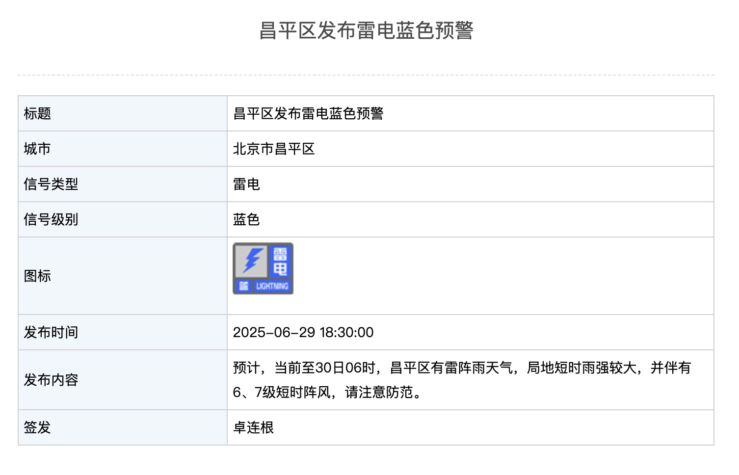 預計,當前至30日06時,昌平區有雷陣雨天氣,局地短時雨強較大,並伴有6、7級短時陣風,請注意防範。