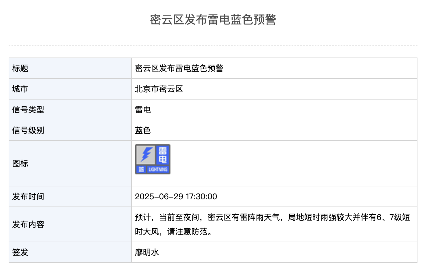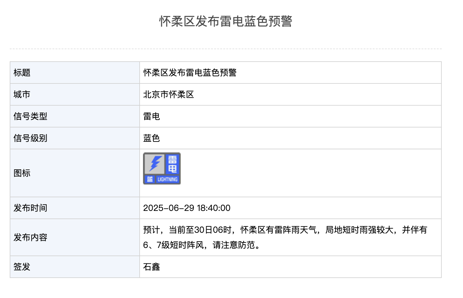 截至目前,北京市房山區、通州區、平谷區、密雲區、海淀區、豐台區、昌平區、懷柔區、西城區、東城區和朝陽區發佈雷電藍色預警。詳情如下: