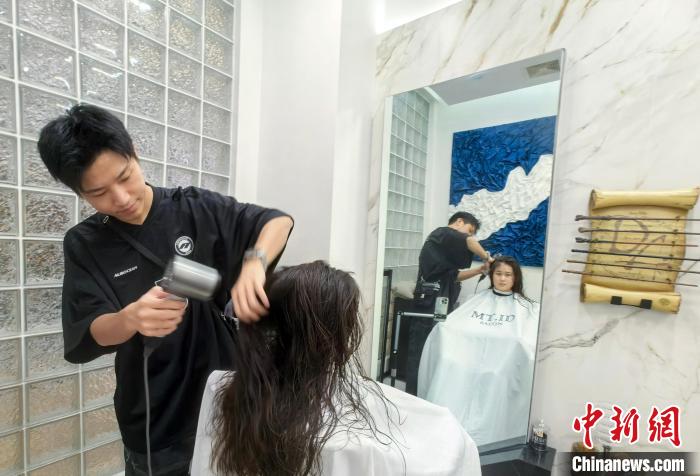 6月28日,馬克在美髮店裏給李曼銥設計髮型。中新社記者 蔣雪林 攝