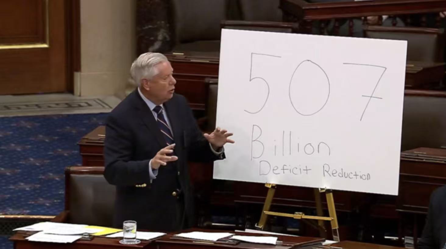 當地時間6月29日下午,美國參議院預算委員會主席林賽·格雷厄姆(南卡羅來納州共和黨人)在參議院攜帶手繪圖板上台,展示國會預算辦公室(CBO)的一項新評估,宣稱共和黨版本的*“大而美”法案若按“當前政策基線”估算,將在未來節省約5000億美元財政支出*。