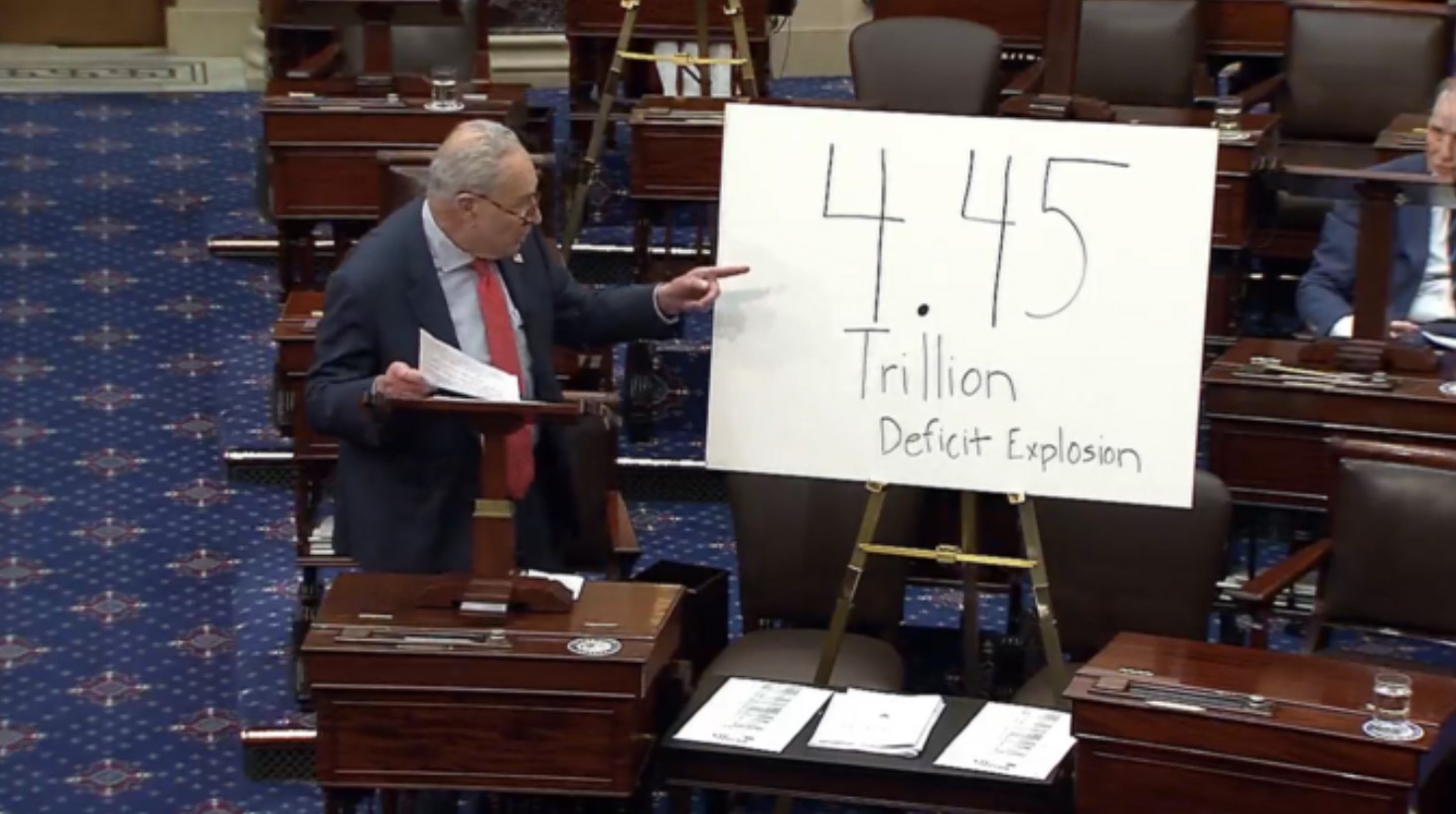 幾個小時後,參議院少數黨領袖查克·舒默(紐約州民主黨人)也拿着一塊自制紙板上台,還擊稱該法案實際上將增加4.45萬億美元聯邦赤字。