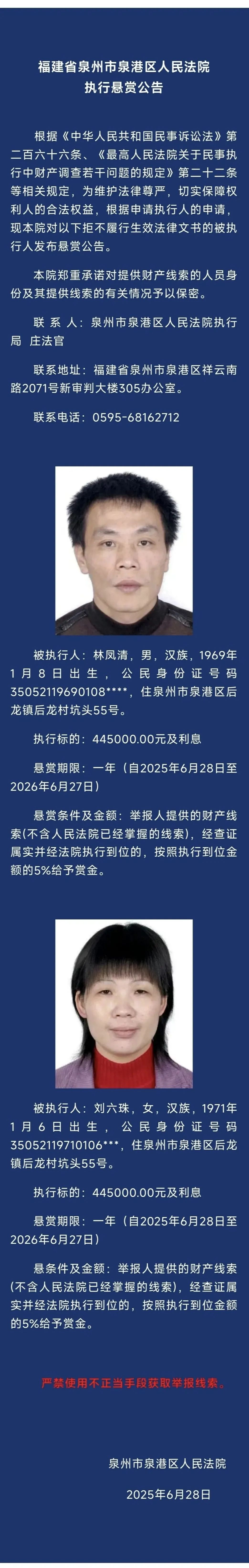 根據《中華人民共和國民事訴訟法》第二百六十六條、《最高人民法院關於民事執行中財產調查若干問題的規定》第二十二條等相關規定,為維護法律尊嚴,切實保障權利人的合法權益,根據申請執行人的申請,現本院對以下拒不履行生效法律文書的被執行人發佈懸賞公告。