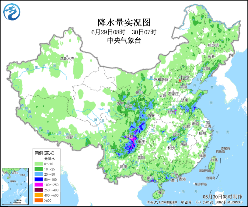 昨日,最強降雨出現在四川中東部,大部地區出現暴雨或大暴雨,四川宜賓和自貢局地特大暴雨(250~292毫米),上述地區最大小時降雨量達90~117毫米。預計今天,強降雨中心將位於四川東北部 、重慶北部、陝西南部等地,上述地區有暴雨或大暴雨(100~200毫米),局地並伴有短時強降水或雷暴大風等強對流天氣。