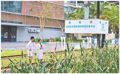 在位於海南三亞的試驗田裏,農業科研工作者使用軌道式高通量植物表型採集平台收集玉米性狀信息。