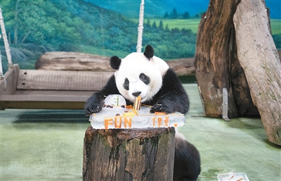 圖為大熊貓“圓寶”在享用園方以甘蔗、鳳梨、竹子等食材製作的冰塊蛋糕。