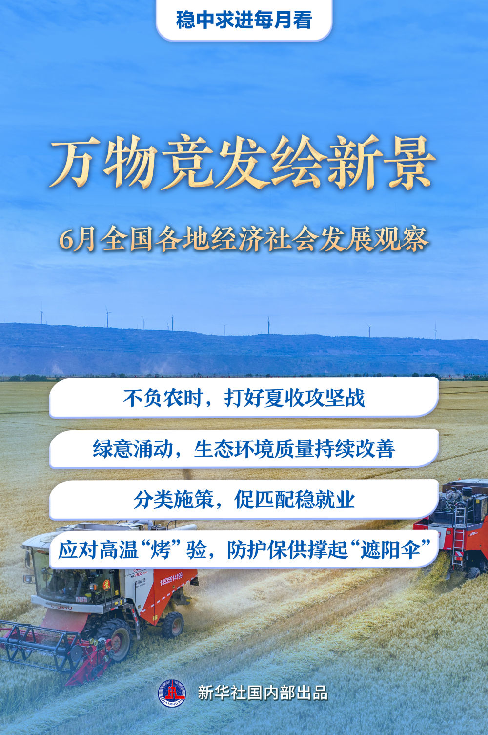 6月仲夏,萬物豐茂。廣袤農田上,“三夏”生產進入關鍵階段;綠水青山間,低碳發展不斷繪就新圖景;全力穩就業,政府、企業與高校同頻共振;高温“烤”驗下,做好各項保障工作……上半年收官之月,各地各部門統籌推進穩增長、促改革、惠民生舉措,推動經濟社會沿着高質量發展之路穩步前行。