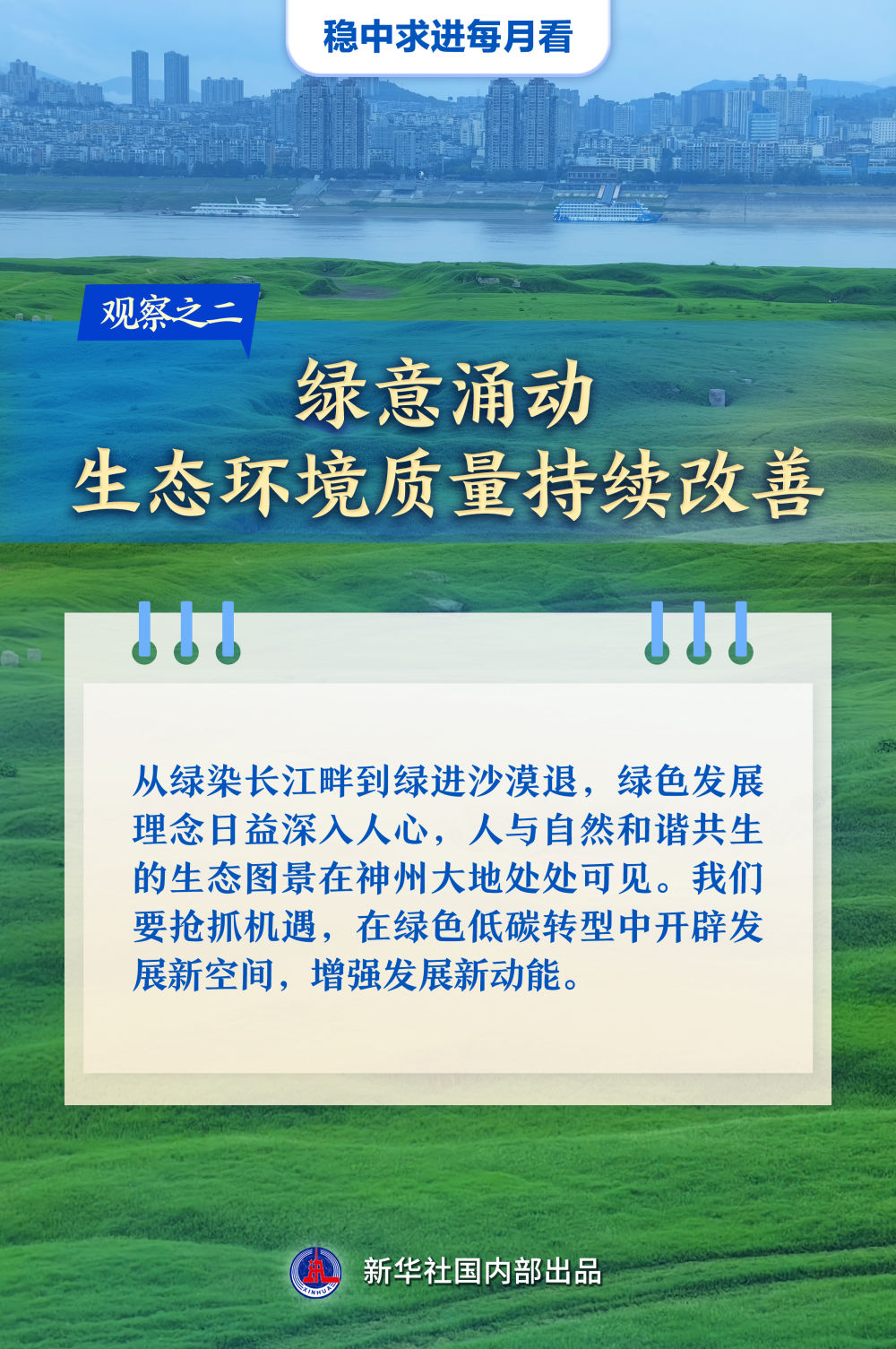 【記者觀察】從綠染長江畔到綠進沙漠退,綠色發展理念日益深入人心,人與自然和諧共生的生態圖景在神州大地處處可見。我們要搶抓機遇,在綠色低碳轉型中開闢發展新空間,增強發展新動能。