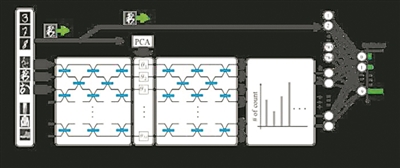 為開發圖像識別系統,團隊設計了一種新型量子AI架構。在模擬實驗中,灰度圖像數據首先被壓縮處理,並編碼到單光子的量子態中。隨後,這些光子被注入一個複雜的光學網絡(量子水庫),在其中干涉形成豐富的高維模式。探測器記錄光子的輸出位置,反覆採樣形成玻色子採樣的概率分佈。最終,這些量子輸出與原始圖像數據結合,通過一個簡單的線性分類器進行識別。
