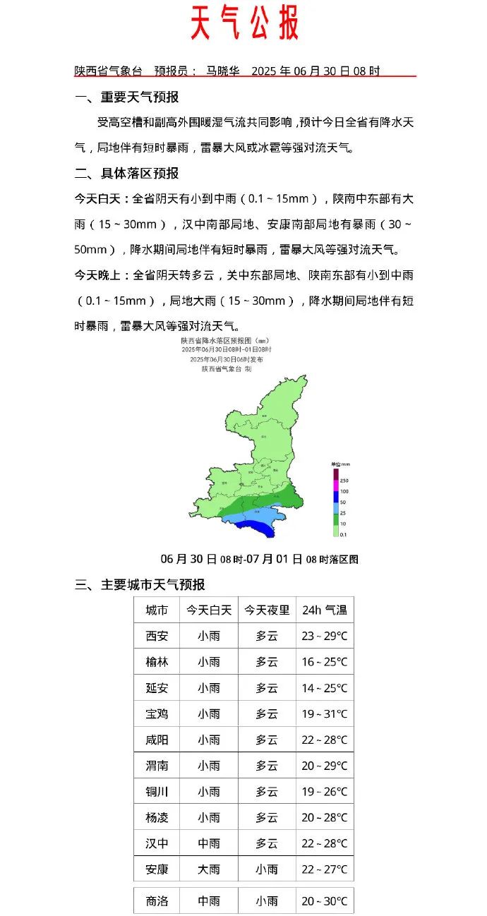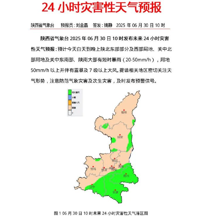 預計今天白天到晚上陝北東部部分及西部局地、關中北部局地及關中東南部、陝南大部有短時暴雨(20-50mm/h),局地50mm/h以上並伴有雷暴及7級以上大風。