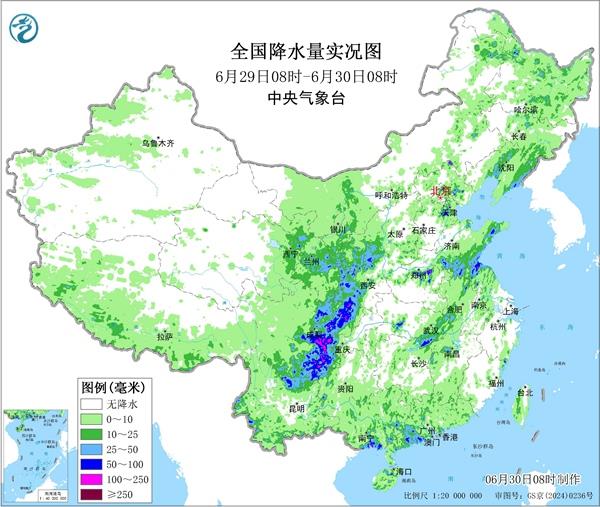 今天,四川盆地等地仍為全國強降雨核心區,四川東北部、重慶大部、陝西南部有大到暴雨,其中四川東北部、重慶北部等地部分地區有大暴雨,上述部分地區伴有短時強降水,局地雷暴大風等強對流天氣。