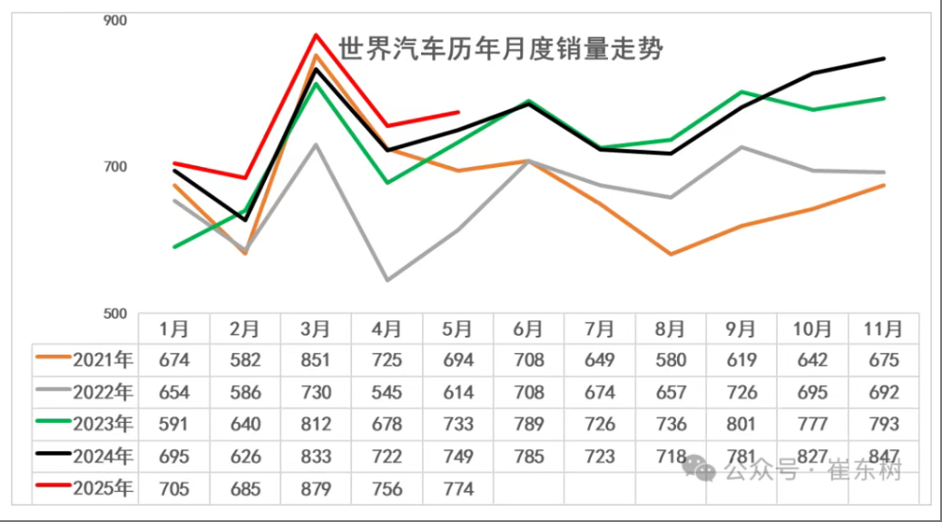 數據顯示,2025年5月的世界汽車銷量達到774萬台,同比增3%。雖然美國、中國車市的5月走強,但2025年5月較2018年5月峯值仍低4%,處歷年的中高位水平。