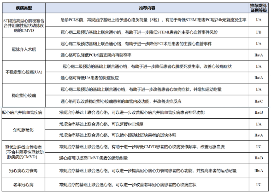 《通心絡防治冠心病臨牀應用中國專家共識》2024:進一步明確了通心絡在穩定型心絞痛、冠狀動脈微血管疾病、冠心病介入治療術後等場景中的應用價值。在該《共識》中,通心絡在一、二級預防和急性冠脈綜合徵(不穩定型心絞痛、急性心梗)防治方面獲得8個Ⅰ類推薦,9個A級推薦,是首個在急性冠脈綜合徵獲得Ⅰ類推薦的創新中藥。