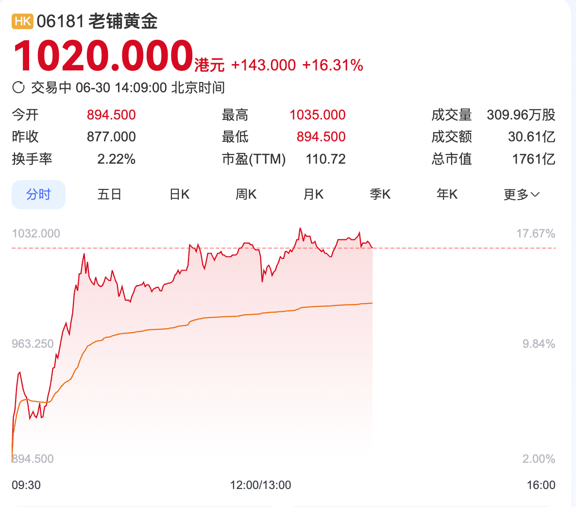 【環球網財經綜合報道】6月30日,老鋪黃金股價強勢上揚,漲幅超過16%,股價達1020港元/股,時隔近一個月再度站穩千港元關口。業內認為,此輪行情與公司海外業務突破密切相關,其位於新加坡濱海灣金沙的新門店於6月21日開業後表現遠超預期,成為股價催化劑。
