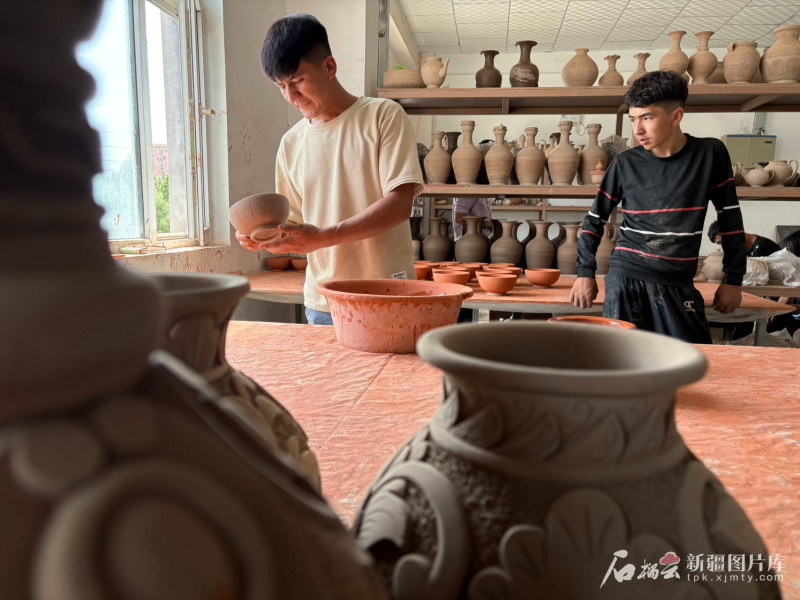6月27日,阿克陶縣巴仁鄉就業實訓基地內的米拉斯土陶手工藝專業合作社裏,年輕匠人正在製作土陶。石榴雲/新疆日報記者 王晶晶攝